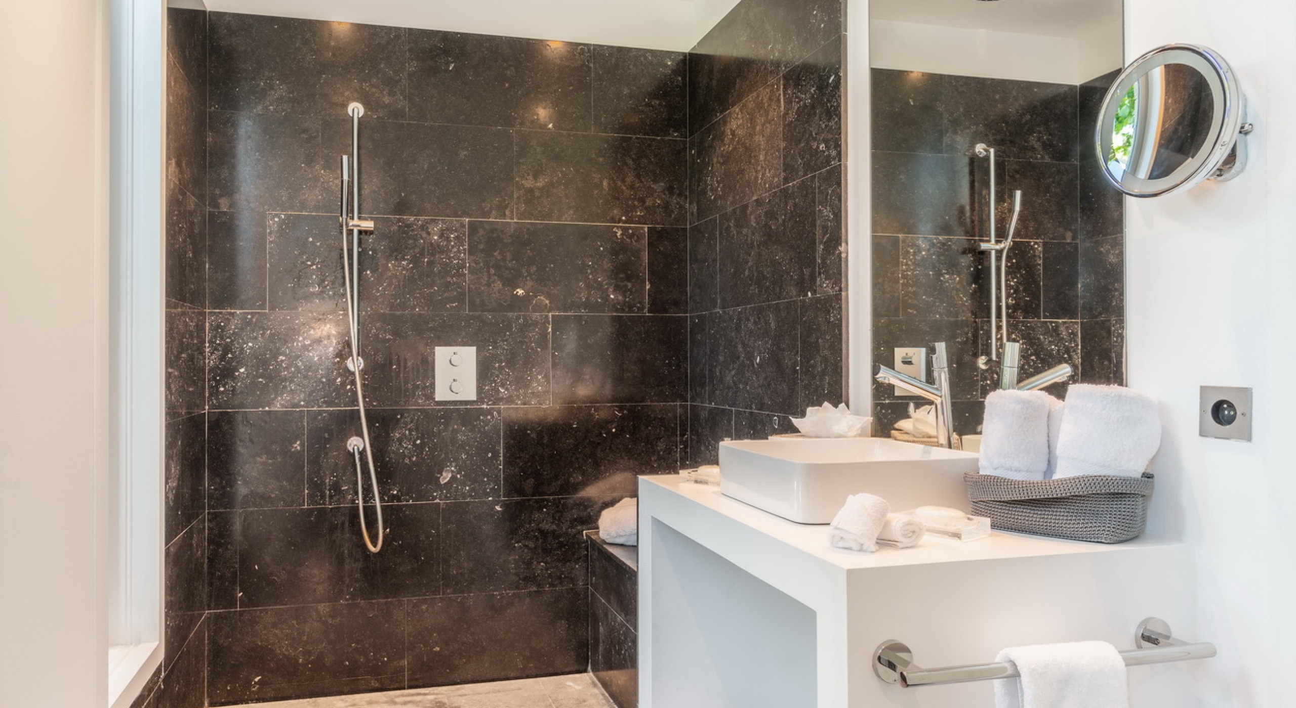 The bedroom of this pleasant villa is warm and welcoming and has its own bathroom. It is also equipped with a massage table.