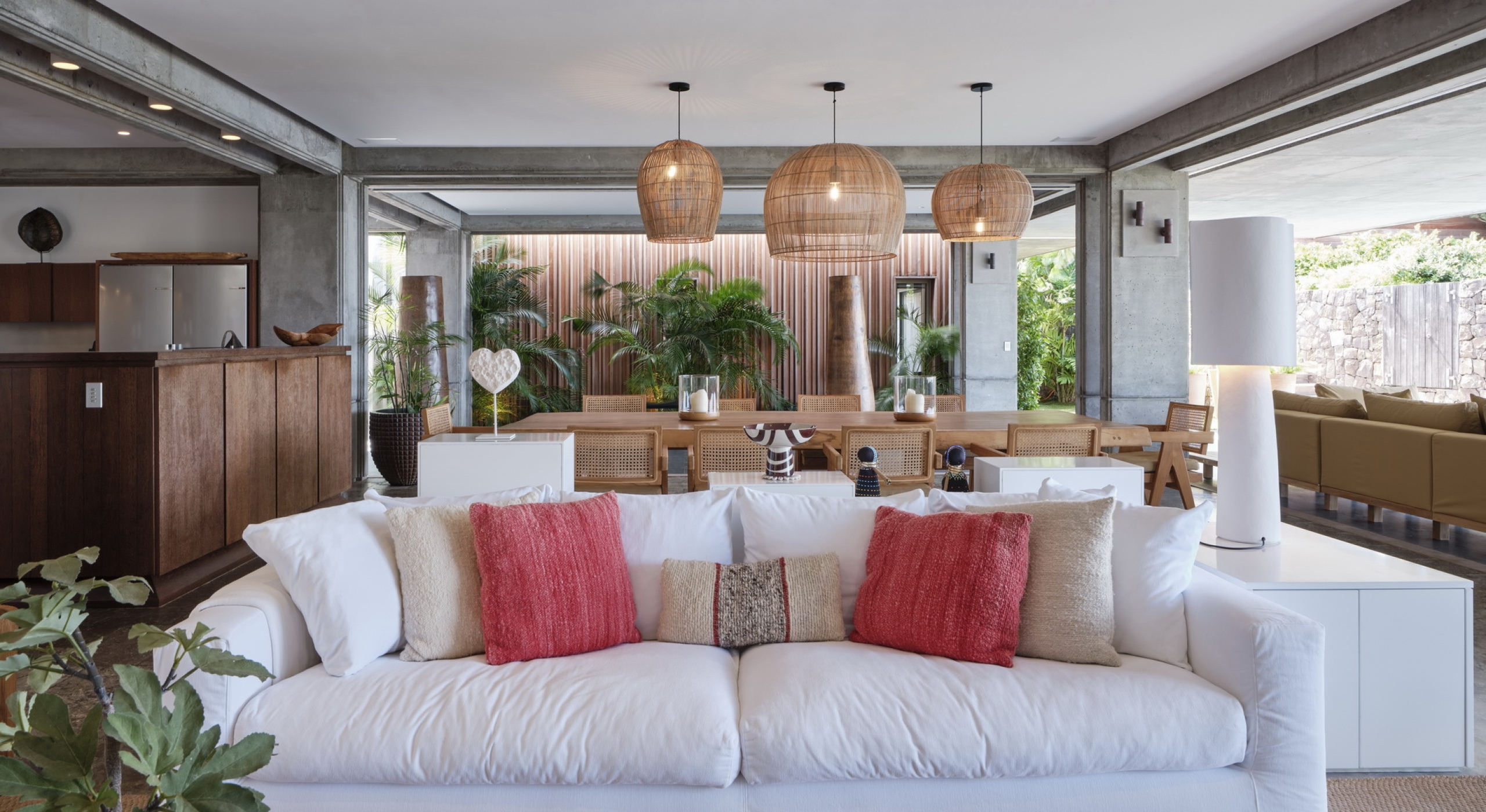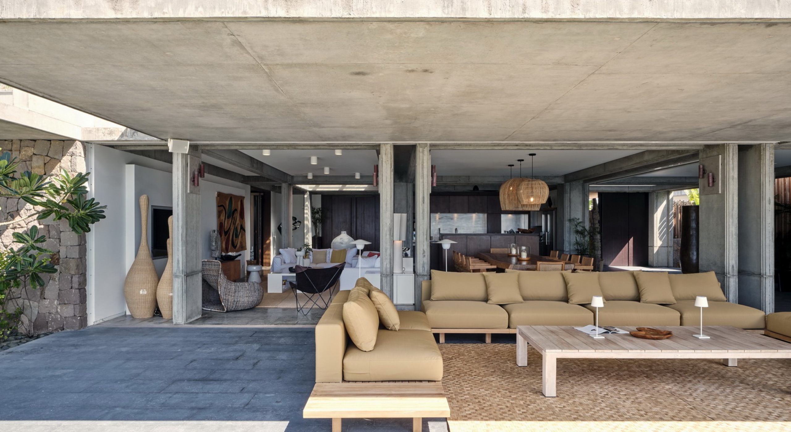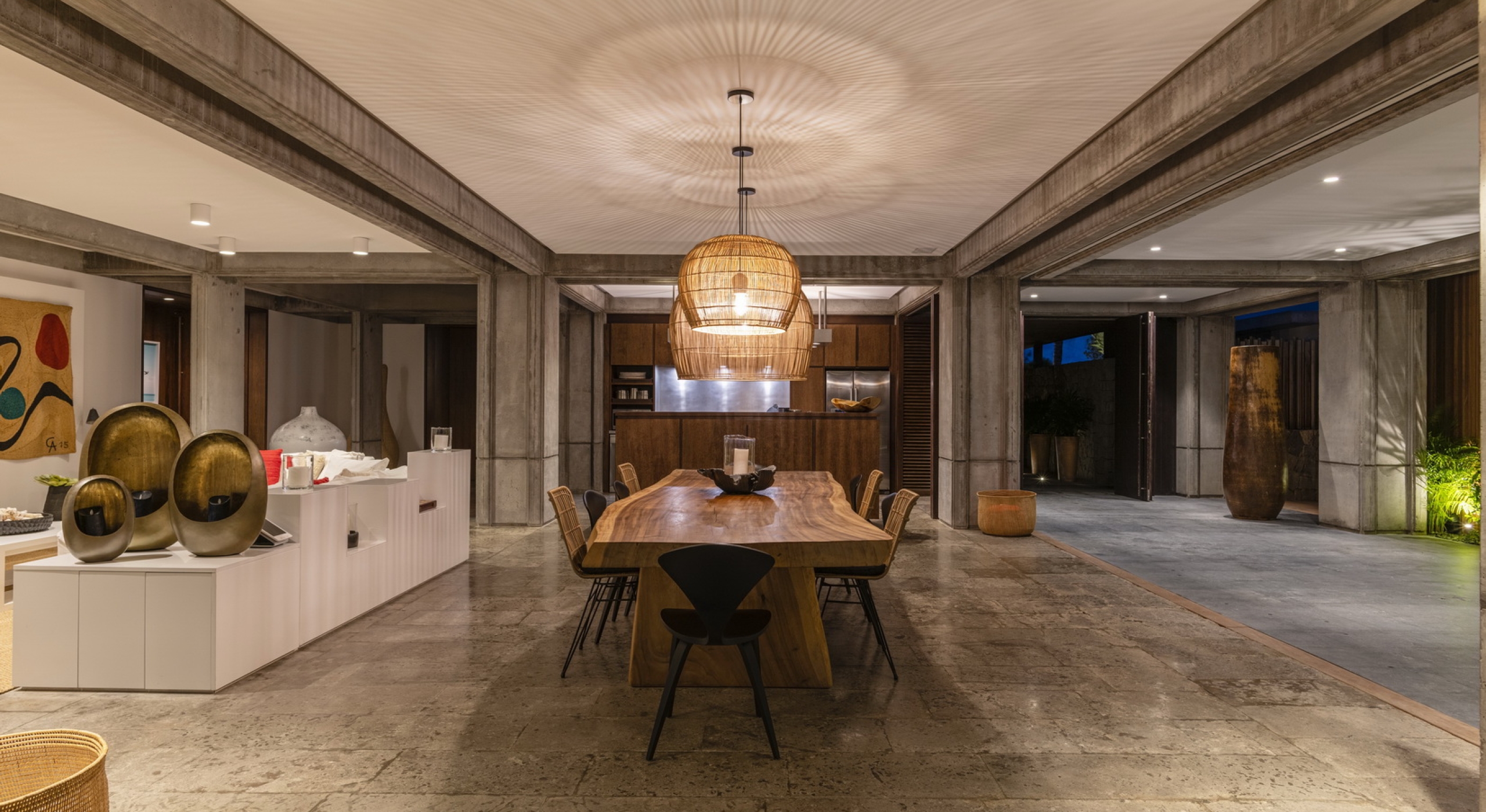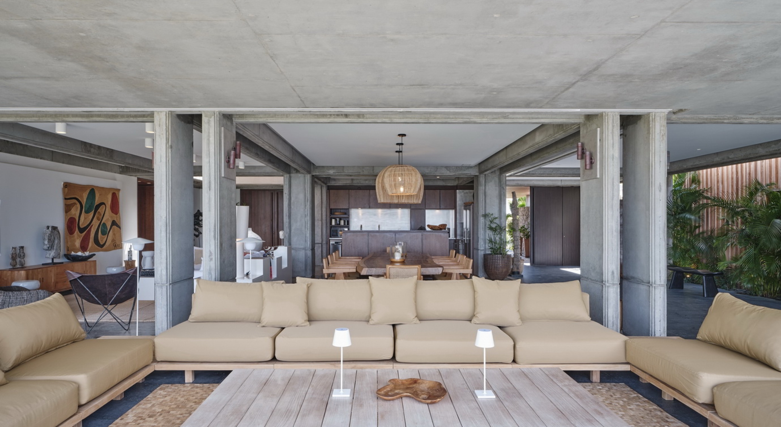 The large living room with American kitchen opens onto the outside, where there are spacious lounge areas and a magnificent infinity pool.