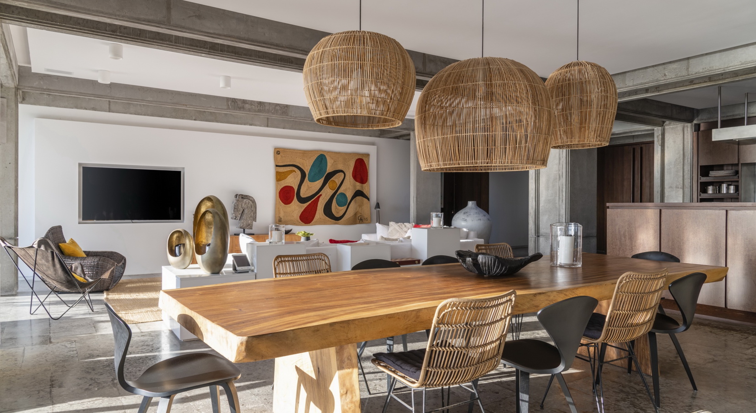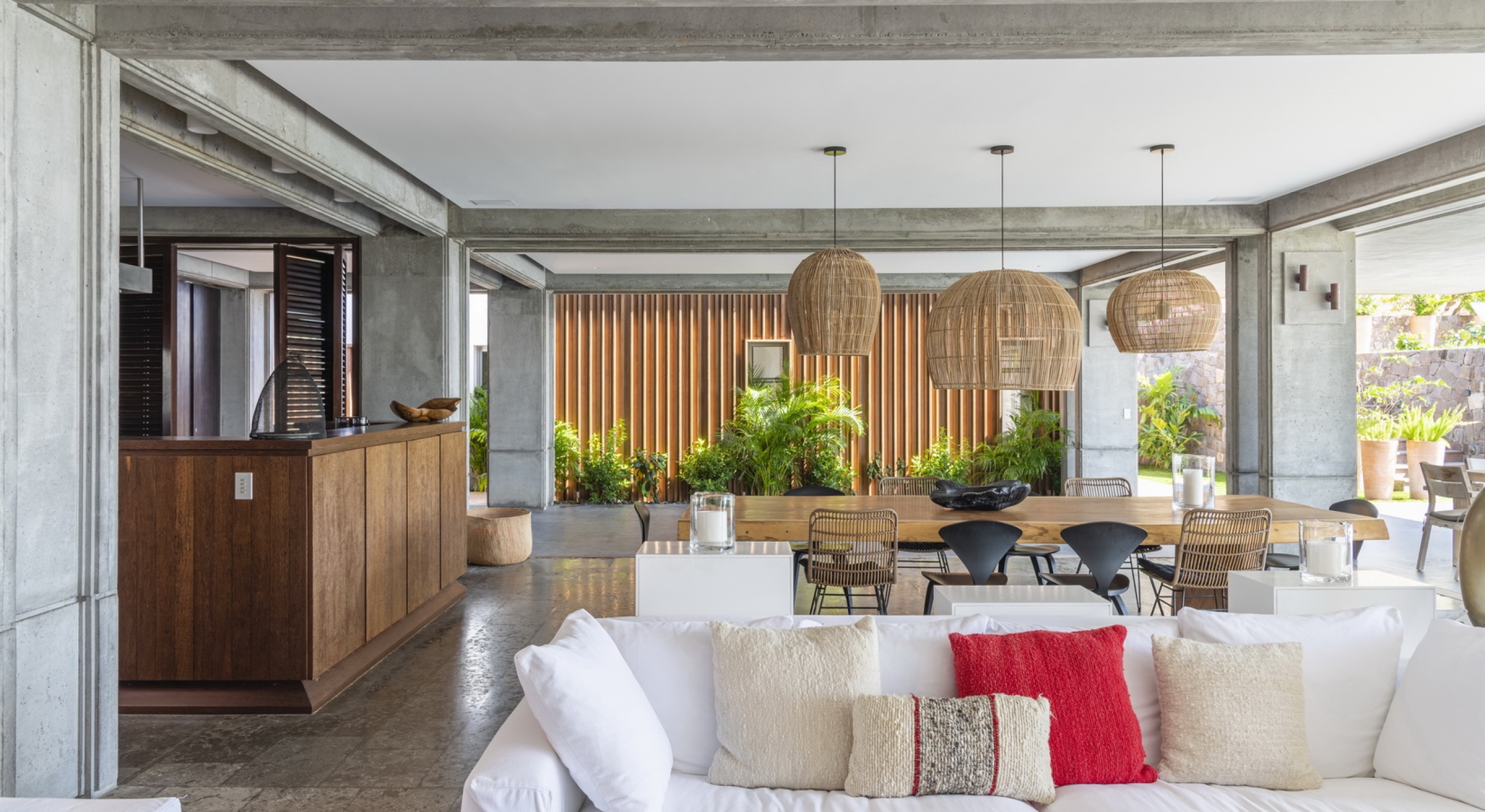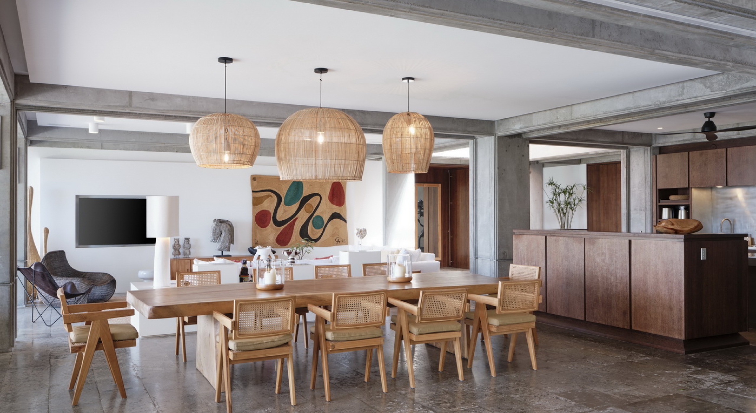 The large living room with American kitchen opens onto the outside, where there are spacious lounge areas and a magnificent infinity pool.
